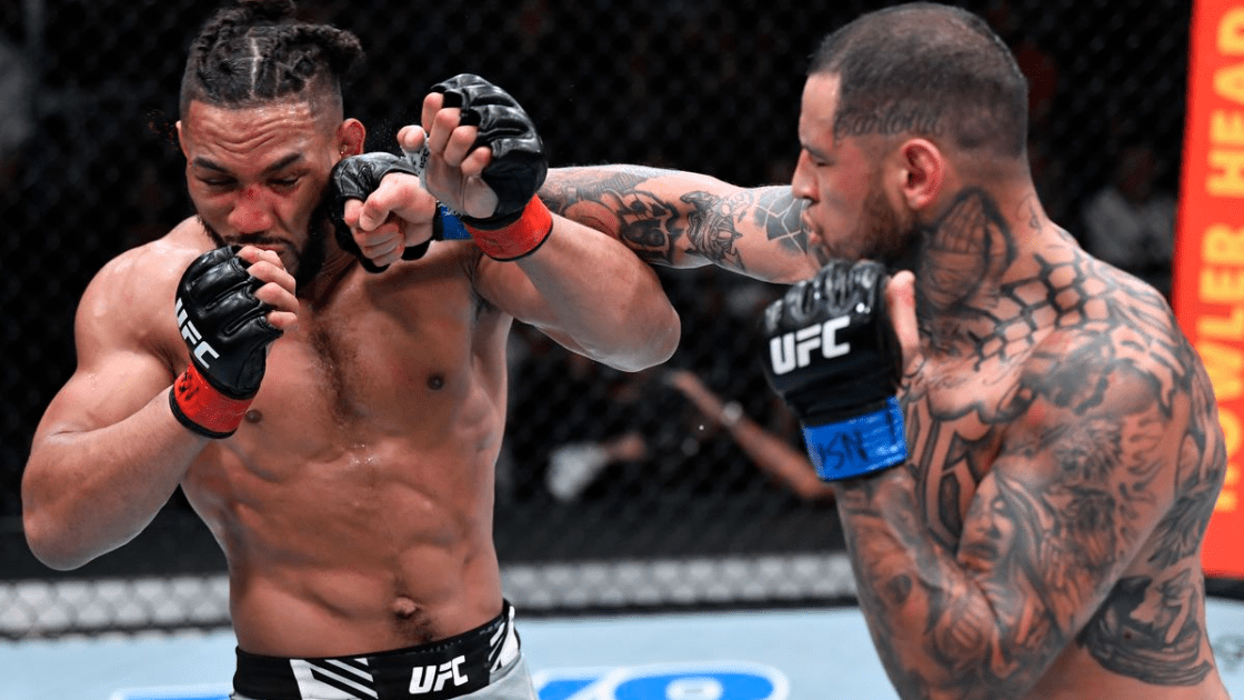 That’s the similarly ever-present Darren Stewart on the receiving end of a Jacoby ass-beating about three minutes into the first round, representing a nice step-up win for the veteran kickboxer. Stewart’s record hasn’t been super great in the UFC, but he’s been in there with formidable guys: Kevin Holland, Eryk Anders, Edmen Shahbazyan. While those fights have vacillated from thrilling to incredibly boring, he’s always been very competitive. No one has kicked his ass the way Jacoby did on Saturday.